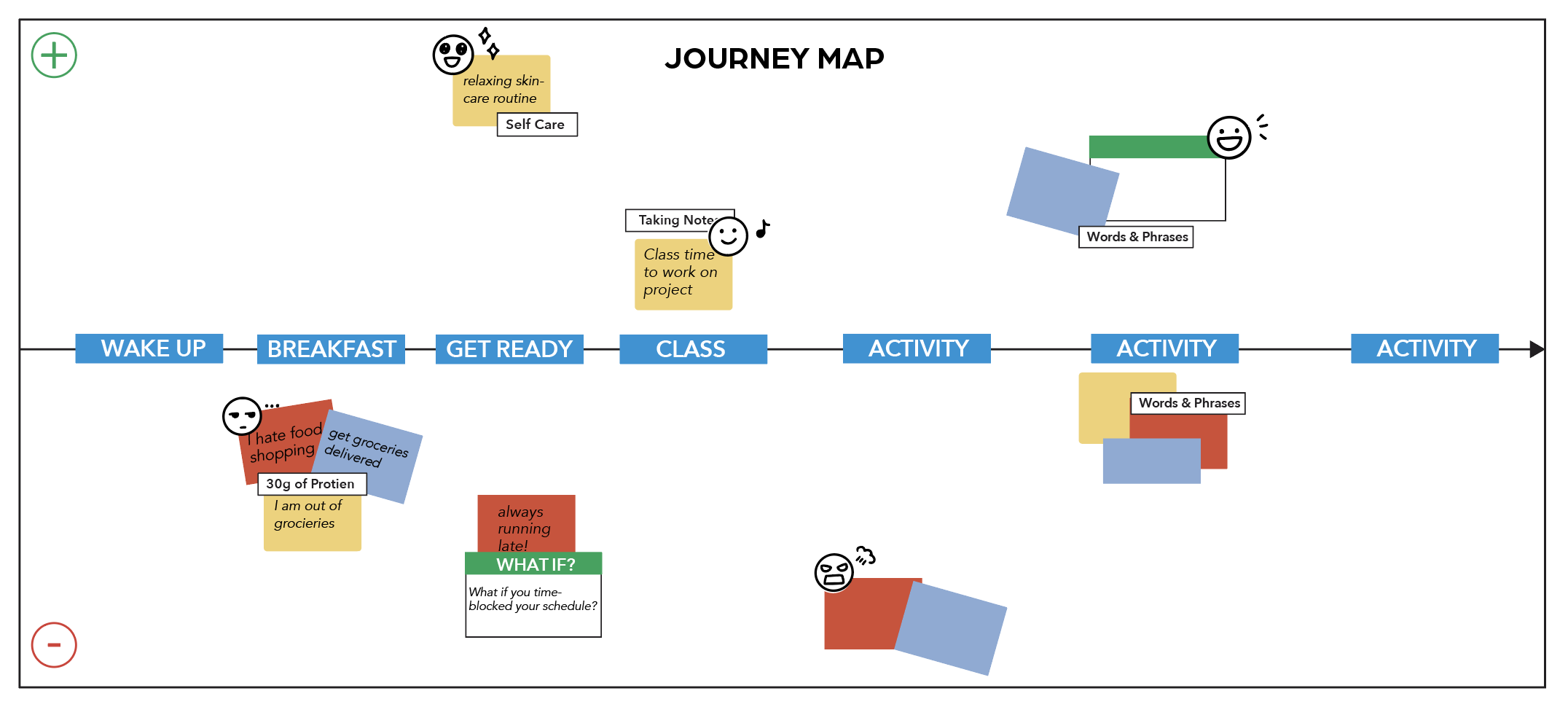 The sprinters were tasked with creating a journey map based on a typical practice day or a session preparing for a track meet. Each map outlined their activities in sequential order, and participants added depth to each step using items from the toolkit (see journey map toolkit). To reflect how positive or negative their experiences were, they positioned these details higher or lower on the page, creating a visual representation of their practice journey.