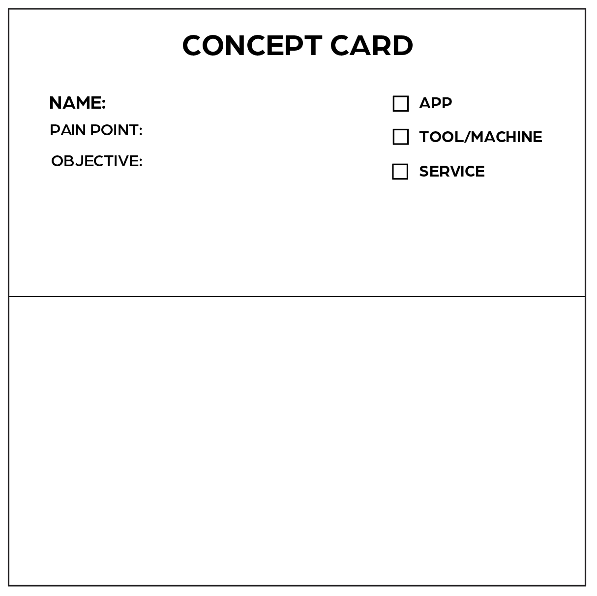 After presenting their journey maps and selecting a pain point to address, each sprinter received a concept card to spark creative and innovative solutions for their chosen challenge. Armed with a toolkit (see concept card toolkit) for inspiration, they had everything they needed to bring their ideas to life. The sprinters identified their pain points, specified whether their concept was an app, tool, machine, or service, and defined its objective. Below the line, they had space to illustrate or describe their concept in greater detail.